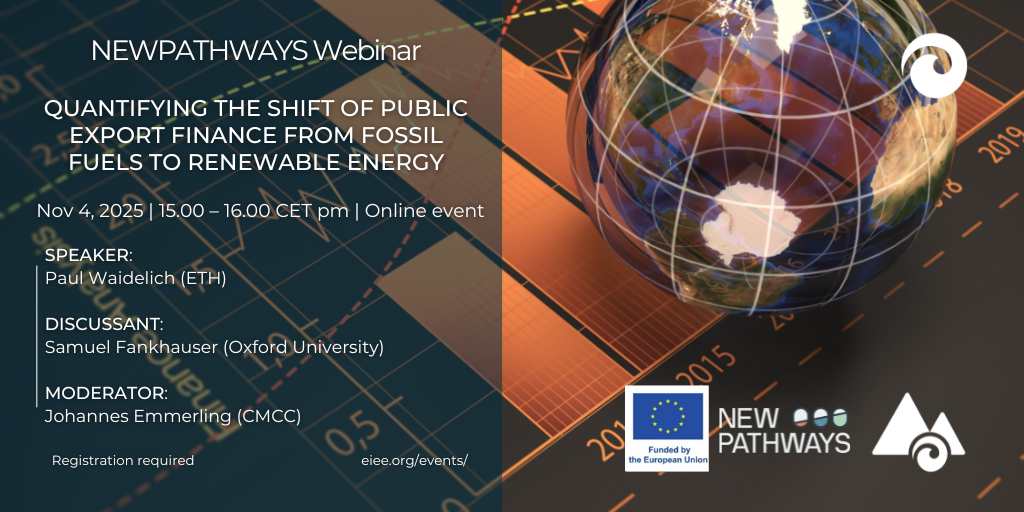 This NEWPATHWAYS webinar presents a recent study that analyses 921 energy deals backed by ECAs from 31 OECD and non-OECD countries (excluding Canada) between 2013 and 2023. The findings reveal that while the share of renewables in global ECA energy commitments rose substantially during this period, ECAs remain heavily involved in the fossil fuel sector. Support patterns vary widely across technologies, value chain stages, and countries.