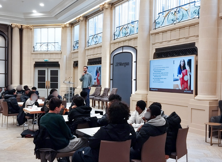 A second meeting focused on inclusion and gender gaps. Speakers proposed a challenge inspired by real-life situations related to gender inequalities in STEM, including gender bias in AI. Each group developed potential solutions to address the issue and prepared a presentation. In the final stage, they pitched their ideas to the other students and to the event organisers from JP Morgan, explaining the problem and presenting their proposed solution.