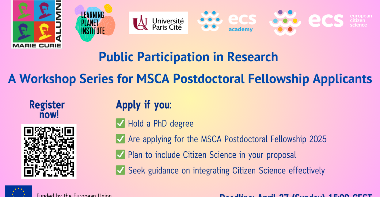 This initiative is a collaboration between the Marie Curie Alumni Association (MCAA) and Université Paris Cité/Learning Planet Institute, as part of the European Citizen Science Academy under the European Citizen Science (ECS) project, funded by the European Union. This workshop series is designed for early career researchers who are interested in applying for the Marie Skłodowska-Curie Actions (MSCA) Postdoctoral Fellowship 2025 and seeking guidance on integrating Citizen Science into their research proposals.