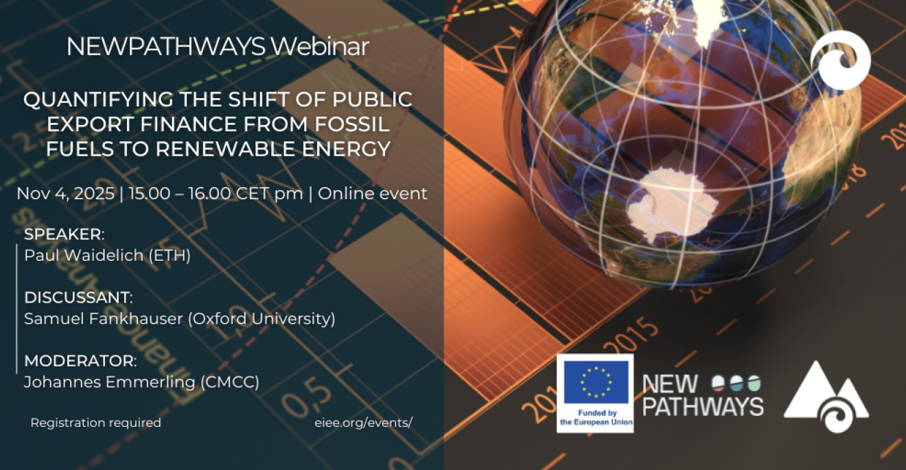 This NEWPATHWAYS webinar presents a recent study that analyses 921 energy deals backed by ECAs from 31 OECD and non-OECD countries (excluding Canada) between 2013 and 2023. The findings reveal that while the share of renewables in global ECA energy commitments rose substantially during this period, ECAs remain heavily involved in the fossil fuel sector. Support patterns vary widely across technologies, value chain stages, and countries.